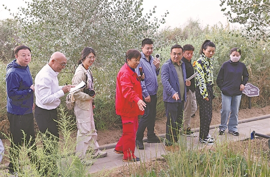 塔中沙漠植物园始建于2003年,由塔里木油田和中国科学院新疆生态与地理研究所共同建设。这是国内首个在流动沙漠腹地利用荒漠植物组景营造的逆境园林,也是世界上自然环境最为恶劣的沙漠植物园。通过中国科学院专家常青的介绍,记者们了解到这些植物背后的故事:有的植物能够在几乎滴水不存的环境下存活数月甚至数年;有的则拥有强大的根系,能够深入沙土数米以寻找水源;还有的植物叶片演化成刺状,以减少水分蒸发。这些都是生命在极端条件下展现出的顽强与智慧。