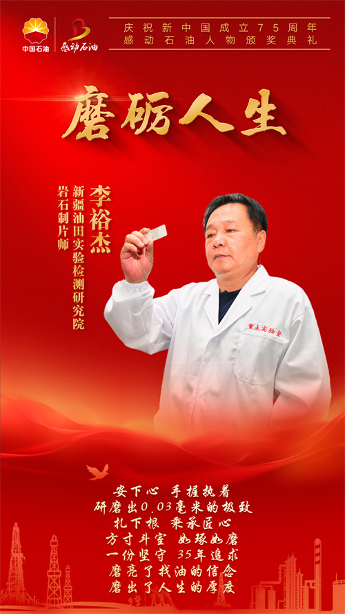 岩石制片师是一个小众却不可或缺的职业。李裕杰精细打磨了近10万个岩片,把手上的指纹都磨掉了。他精益求精,在0.03毫米的厚度中创新方法,帮助科学家寻油探气,奠定行业标准基础;他淡泊名利,将经验倾囊相授,将荣誉主动让人。他磨过的岩片接续起来构成了准噶尔盆地14万米长的地下岩心,垒起来相当于16座珠穆朗玛峰的高度,帮助新疆油田先后发现了玛湖油田、吉木萨尔页岩油等22个油气田。