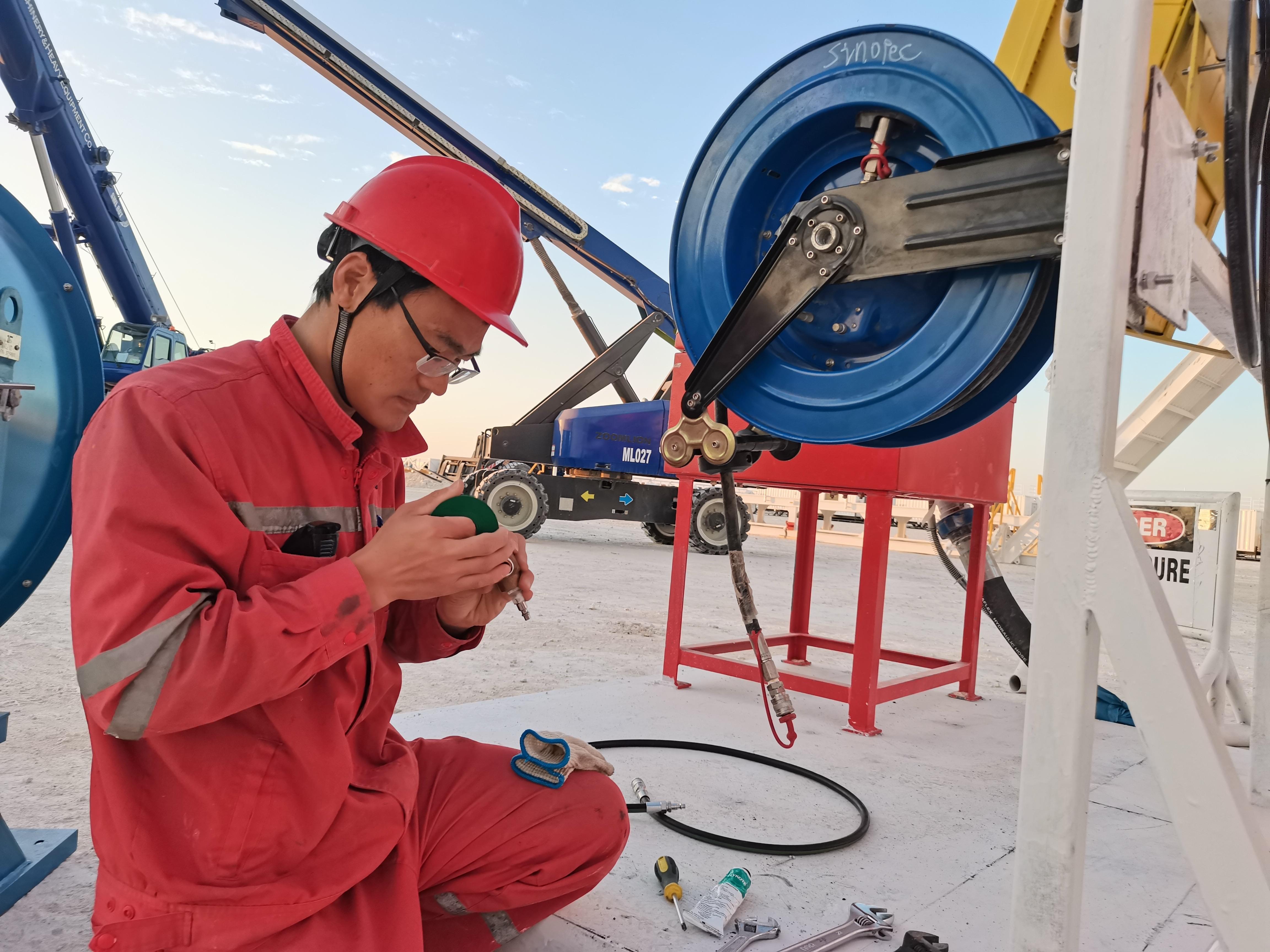 在SP-99队的配套现场,中方与外方共同协作,杨宽带领两名巴基斯坦工程师,顶着烈日爬上套管扶正台安装供气滚轮。他们白天现场安装,晚上交流技术方案,改进安装流程和细节,日夜赶工,保证服务质量,从开始工作到顺利通过甲方验收,仅用了11天。