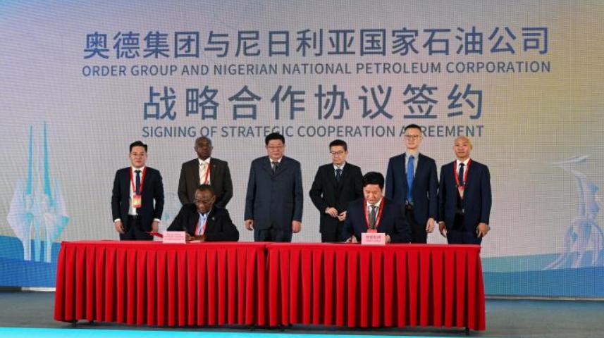 图为奥德集团董事长林波与尼日利亚国家石油公司天然气与电力投资主管萨利胡·努胡·贾马里签署战略合作协议。