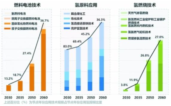 我国工业领域正在攻关绿氢合成氨、绿氢制甲醇、绿氢冶金等技术,到2060年,在工业应用领域占比有望达到60%;在建筑应用领域,供暖、燃气有望实现高效率燃料电池发电系统的商业推广;在交通应用领域,氢内燃机将实现小功率示范,到2060年占比有望达到31%。