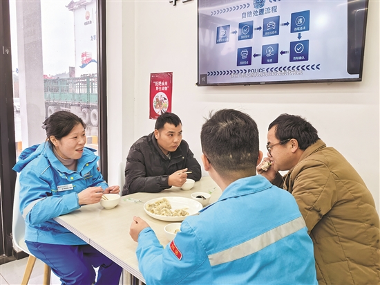 春运期间,徐桂芳(左一)与站经理一同招待卡车司机吃饺子。