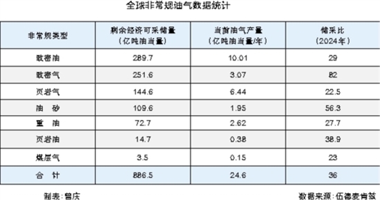 全球非常规油气资源充足,开发潜力巨大。2024年,全球非常规剩余油气可采储量与剩余经济可采储量分别为1348亿吨油当量、886.5亿吨油当量。其中,非常规剩余油气可采储量占全球剩余油气可采储量的25.4%。按当前非常规油气年产量24.6亿吨油当量计算,全球非常规油气资源可供开采的时间可达36年。