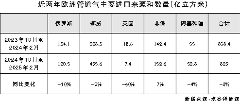 从供应端看,2024年10月至2025年2月,欧洲进口管道气同比减少3%,俄罗斯、挪威和英国供应量均下降。俄罗斯过境乌克兰管道天然气于2025年1月1日停止,其他气源相对稳定,其中土耳其溪流量在2025年1月至2月保持在平均5458万立方米/日左右,同比增加29%。LNG方面,据睿咨得能源数据,2024年10月至2025年2月,欧洲进口LNG为4542万吨,同比减少5.1%。其中,2025年1月后,LNG进口量实现同比回升,为自2024年1月以来首次出现月度LNG进口的同比增长。2025年1—2月,欧洲LNG进口量为2039万吨,同比增长达到10.6%。