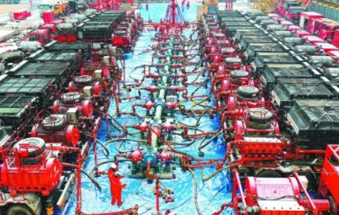 胜利油田页岩油开发井丰页1-1HF井压裂现场。