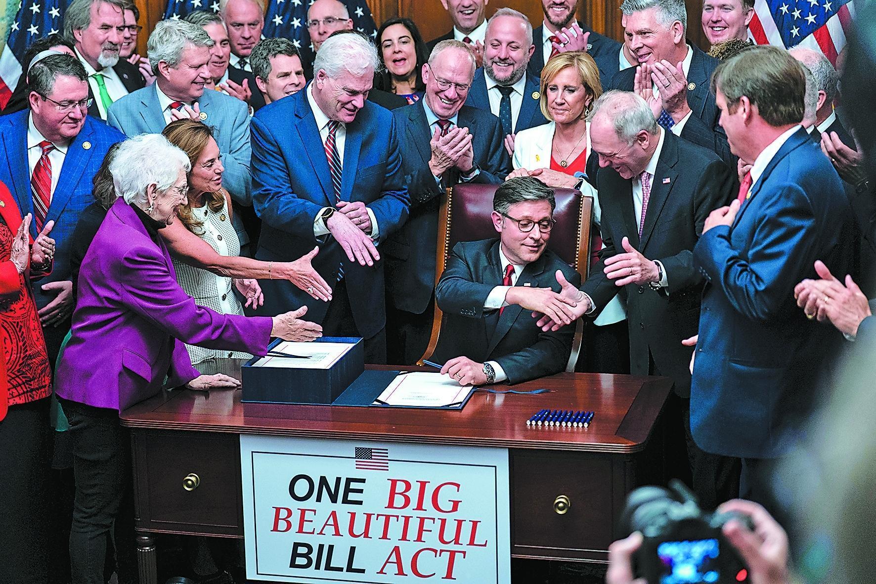 图为7月3日,美国众议院议长约翰逊(中)与多数党领袖、共和党人斯卡利斯握手,庆祝“大而美”法案通过。视觉中国 供图