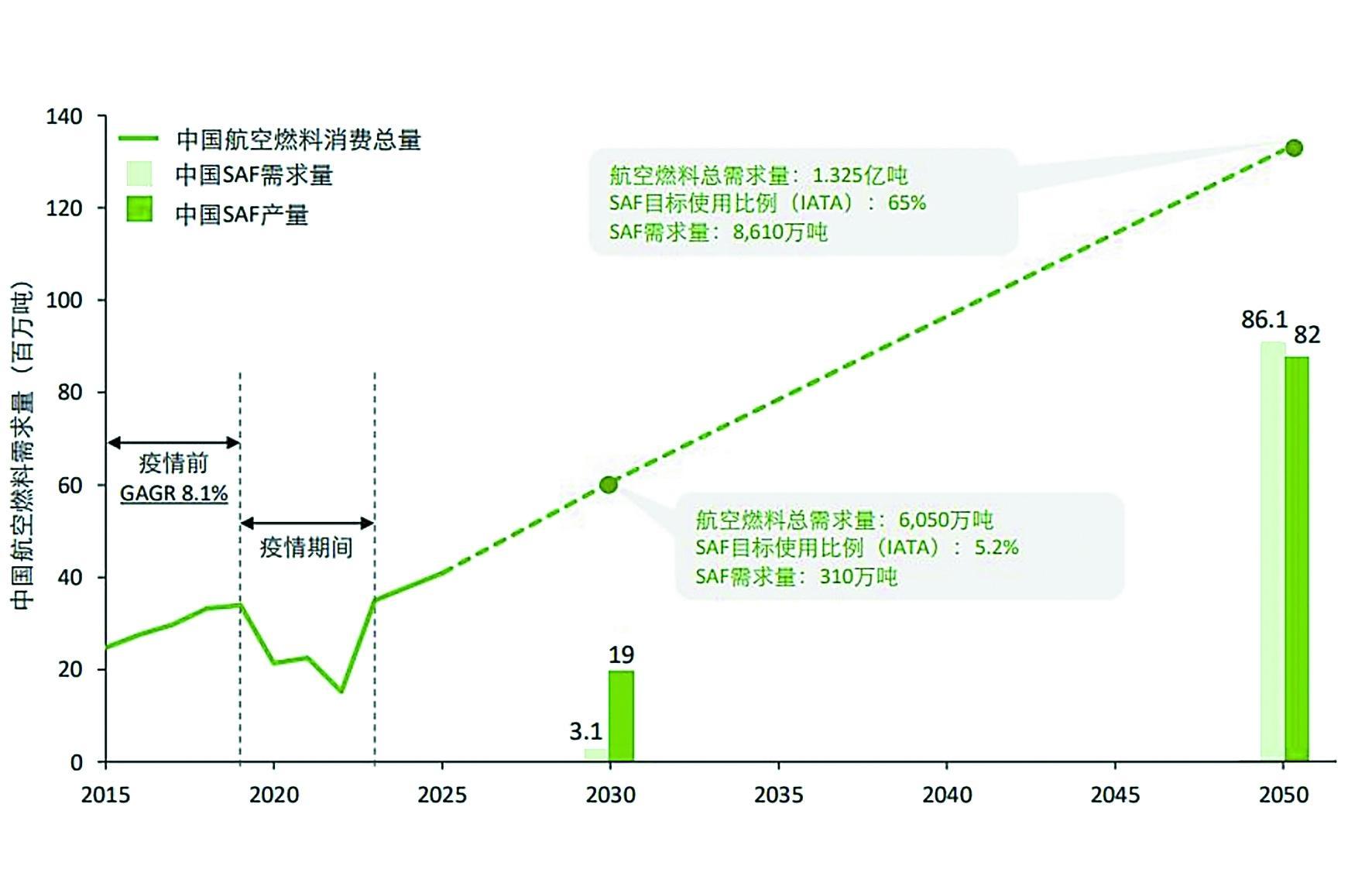 据预测,我国SAF产量2025年将在13万~17万吨,2030年有望增为57万~112万吨。我国SAF需求2030年将达300万吨,2035年达4500万吨,2050年达8600万吨,同样将长期供不应求。