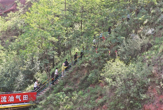 参观完展览馆,众人站在好汉坡下。70度的陡坡上,仿佛仍回荡着老一辈石油人攀爬时的喘息声。屈身于钢管间的身影、泥泞烈日中巡井的脚步,将“阎王坡”踩成好汉坡的故事,藏在磨秃的工鞋、冻裂的手套里,更写在“艰苦创业、勇攀高峰”的精神旗帜上。