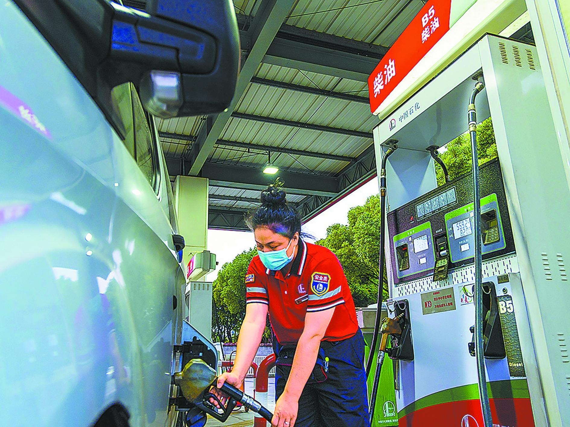 上海石油加能站员工为车辆提供B5柴油加注服务。本报记者 陆佳宏 摄