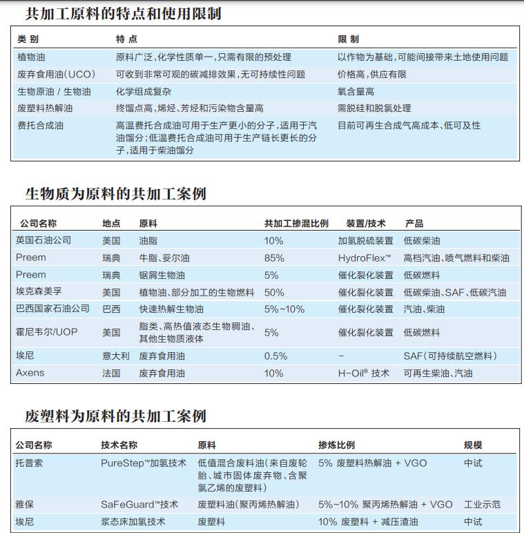 可用于共加工的原料主要有油脂、生物原油/生物油、废塑料热解油及费托合成油。