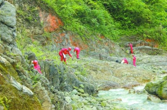 ▲西南油气勘探人员在川西地区龙门山燕子岩二叠系剖面进行实地考察。