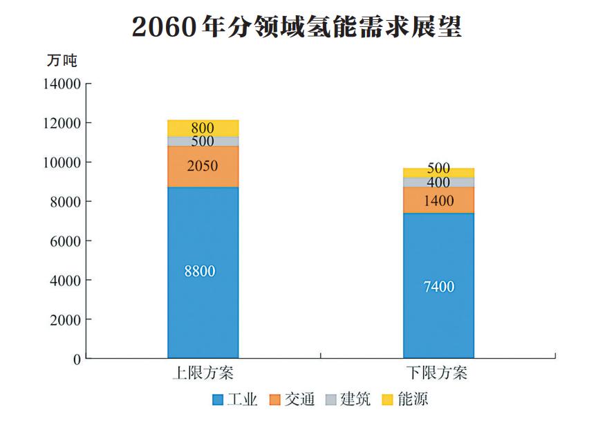 实现碳中和情景下,2060年建筑部门氢能需求为400万~500万吨、能源部门氢能需求为500万~800万吨。2060年我国氢能需求总量在9700万~12150万吨。