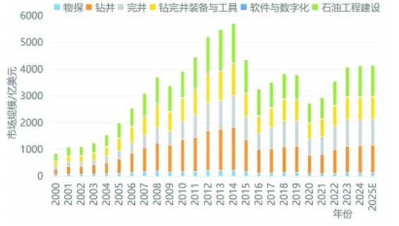 2024年,全球能源转型持续推进,能源结构深刻调整,全球油气供应充裕,需求保持增长,国际油气价格持续回落,振幅收窄。全球油气勘探开发投资小幅增长,低碳领域投资已超越油气。2024年,全球油气工程市场保持稳定,比上年增加1.4%,至4127亿美元,其中石油工程建设、钻井、钻完井装备与工具市场分别增长6.8%、2.2%、2.1%,完井、物探市场分别下降4.7%、4%;陆上市场下降2%,至2758亿美元,海上市场增长9.1%,至1369亿美元。