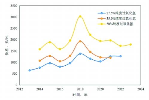 除了2018年因国内装置开工率不足导致的过氧化氢价格短期上涨,我国过氧化氢市场长期保持较为稳定的运行态势,产品整体价格波动差稳定在500~600元/吨,其中纯度27.5%的过氧化氢出厂价750~1250元/吨,纯度35%的过氧化氢出厂价1100~1480元/吨、纯度50%的过氧化氢出厂价1750~2200元/吨。