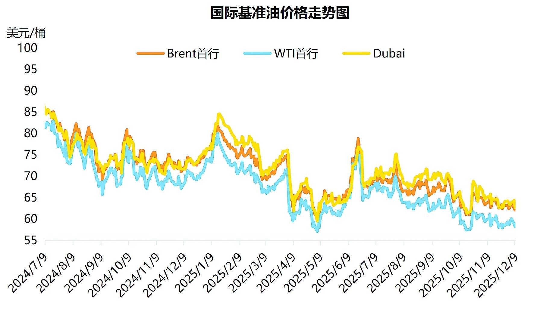 2025年下半年,受欧佩克+持续增产和全球原油市场对未来需求增长预期悲观双重因素影响,布伦特和WTI两大国际基准油价出现一波震荡下跌走势。截至12月初,布伦特和WTI两大原油期货价格最低分别跌至60美元/桶和56美元/桶以下,均较年初下降约30%。在此背景下,部分机构对国际油价未来走势持悲观态度。其中,美国能源信息署(EIA)10月发布短期能源展望报告称,未来几个月,国际油价将面临下行压力,预计布伦特原油价格四季度均价将为62美元/桶,2026年均价将为52美元/桶。但多重因素并不支持2026年国际油价持续大幅走低。