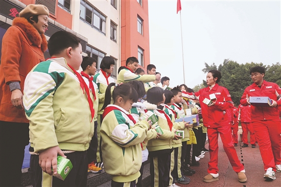 张欢是与其他几名片区青年一道,代表永川区胜利路街道的企业,前去给这些特殊儿童送礼物、献爱心的。送礼物之前,他们与全校师生一同参加了庄严的升国旗和唱国歌仪式。之后,片区牵头单位钻井工程中心第四党支部书记龙隆,代表本单位向孩子们送上了关心和祝福。随后,物探青年志愿者们与社区志愿者一道,给孩子们送上了玩具、体育用品和棉鞋等礼物。