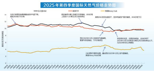 气价方面,2025年10月,亚洲天然气市场关键基准——普氏日韩指标(JKM)价格月末较月初水平小幅走高,但支撑因素偏弱。2025年11月上旬,JKM价格在11美元/百万英热单位左右小幅波动,整体平稳;11月中旬后因船运市场收紧一度导致气价走高,后续因供应较为充足,终端需求不足,JKM价格持续下跌。2025年12月,由于LNG供应量较高,JKM价格曾一度跌至10美元/百万英热单位以下。2025年第四季度,JKM均价为10.66美元/百万英热单位,环比跌幅达9%,同比跌幅达24%。