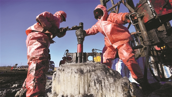 修井作业工人破冰而战。 丁磊 摄