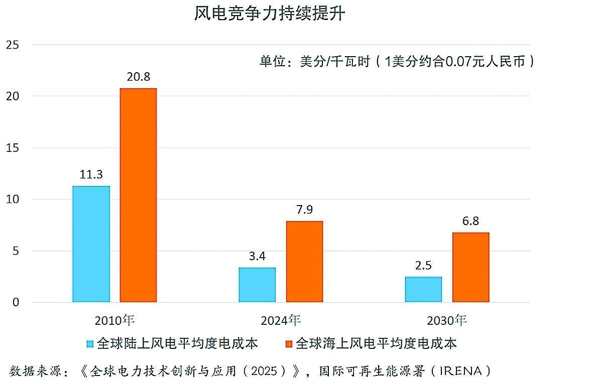 2024年7月,我国风电、太阳能发电累计装机容量达到12.1亿千瓦,提前6年实现了我国2020年12月在气候雄心峰会承诺的“到2030年,中国风电、太阳能发电总装机容量将达到12亿千瓦以上”目标。风电累计装机占比连续多年稳步提升,2024年底,我国全口径发电装机容量33.5亿千瓦,风电装机容量5.21亿千瓦,占比达15.5%。据国家能源局统计,2025年前11个月,全国累计发电装机容量37.9亿千瓦,其中风电装机容量6亿千瓦。