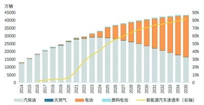 2014~2035年我国汽车保有量与新能源渗透率变化