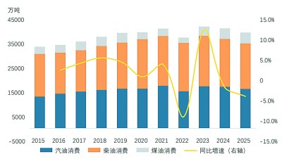 2025~2026年国内成品油以超过4%的速度萎缩,汽柴油消费保持5%左右降幅,航煤保持4%左右增长。