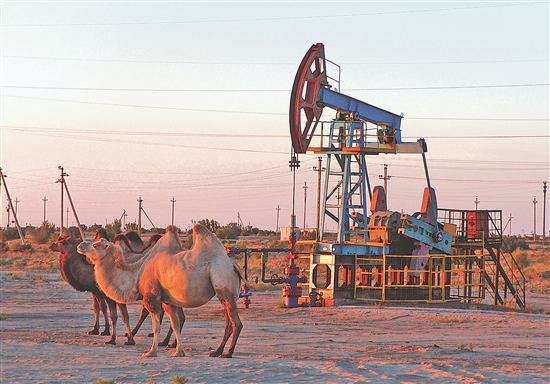 中国石油PK项目多次获哈萨克斯坦国家级环保卓越贡献奖。图为骆驼等草原生物与油田和谐共处。