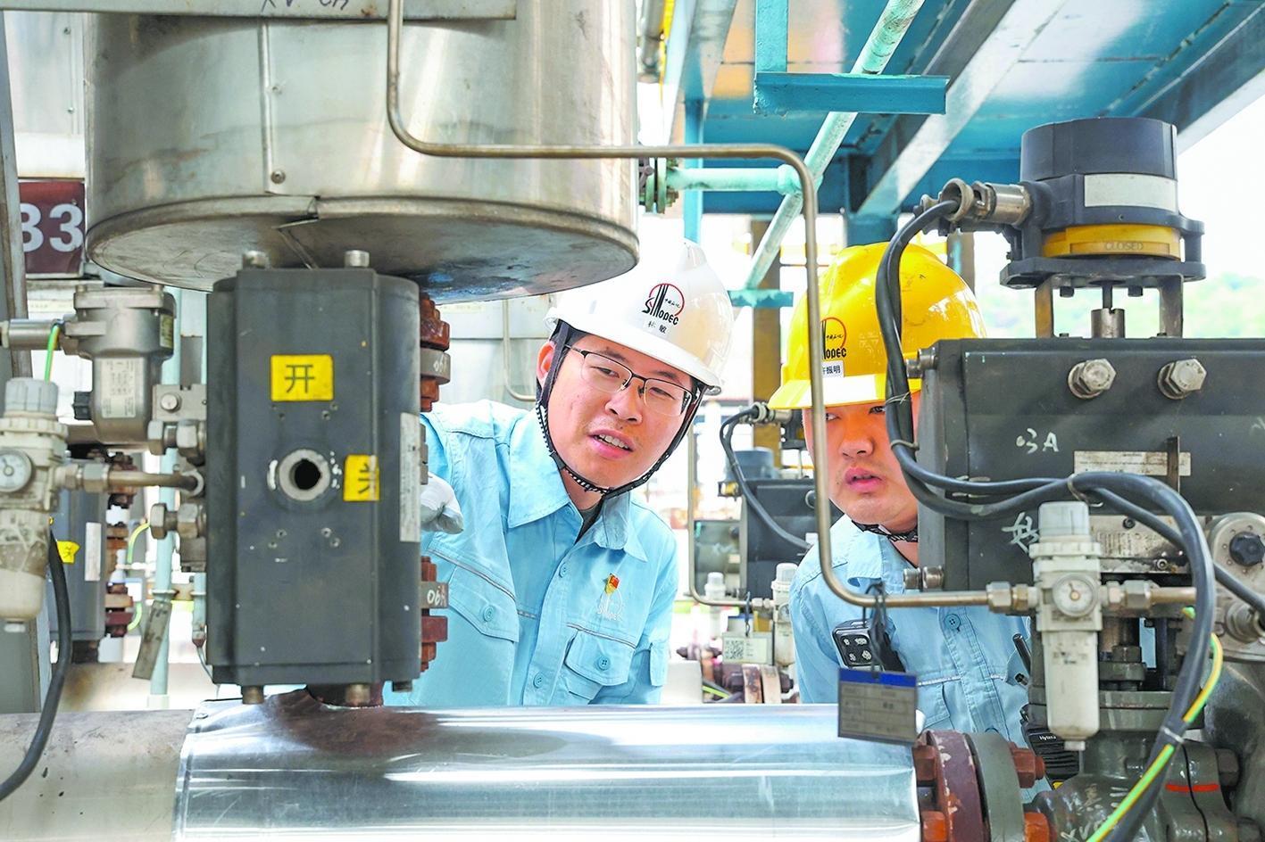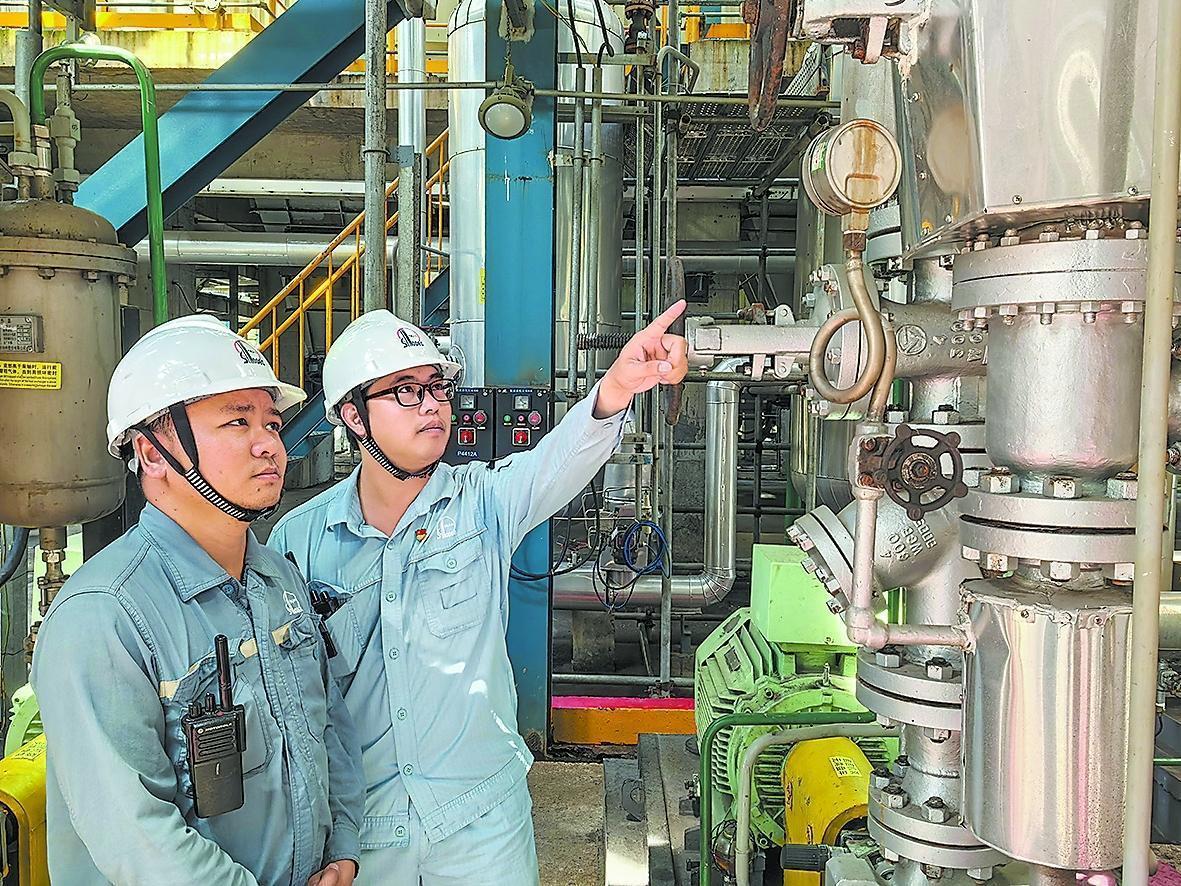 茂名石化高端碳装置管理人员在现场进行优化攻关。李婷摄