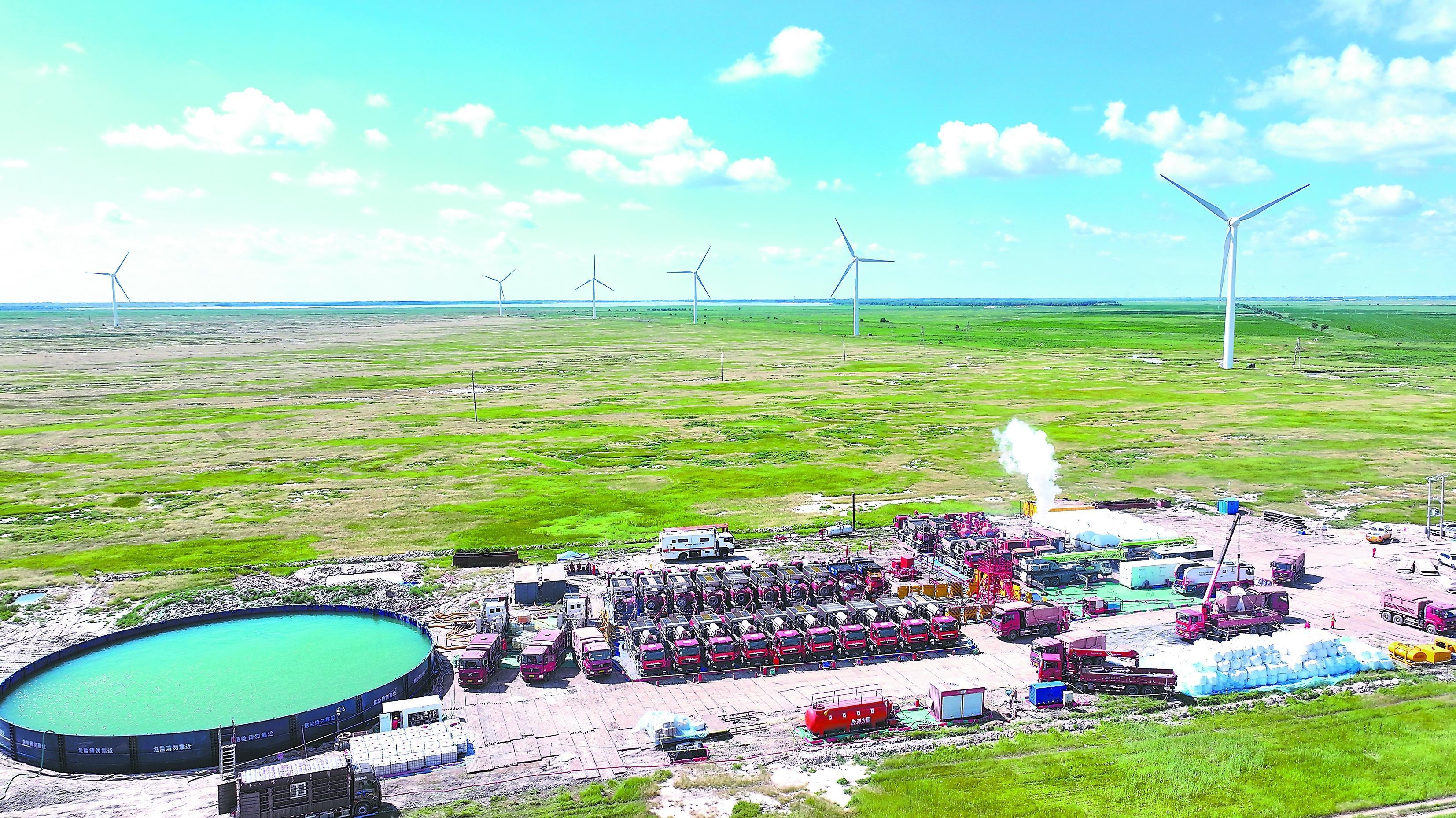 二氧化碳复合压裂技术是实现“低伤害、高造缝、强增能、助环保”多元功效一体化的绿色工艺。该技术充分发挥超临界二氧化碳低黏度、高扩散、酸溶蚀特性,通过前置注入二氧化碳降低破裂压力、激活天然裂缝,后续水基压裂液扩缝携砂,兼具保护储层、增能助排、置换油气、碳封存等多重功能。中国石化聚焦胜利油田济阳页岩油、东北油气致密气藏等非常规油气区块攻关,历经多年探索与技术迭代,形成了前置二氧化碳压裂、二氧化碳多元复合压裂等特色技术。截至2025年底,已在博兴、利津等页岩油井累计实施60余井次,峰值日产油气当量超100吨的井有30余口;二氧化碳多元复合压裂和泡沫压裂技术已在东北油气金山、龙凤山、查干花、聚宝山等多个气田推广应用,平均单井产量提升33.8%。当前二氧化碳干法压裂技术仍面临携砂能力差、施工摩阻大、全链条成本偏高等挑战,中国石化将深化二氧化碳压裂-驱油-封存一体化研究,攻关二氧化碳高效能压裂液体系研发与低成本工艺,推动CCUS(二氧化碳捕集、利用与封存)与压裂协同融合。